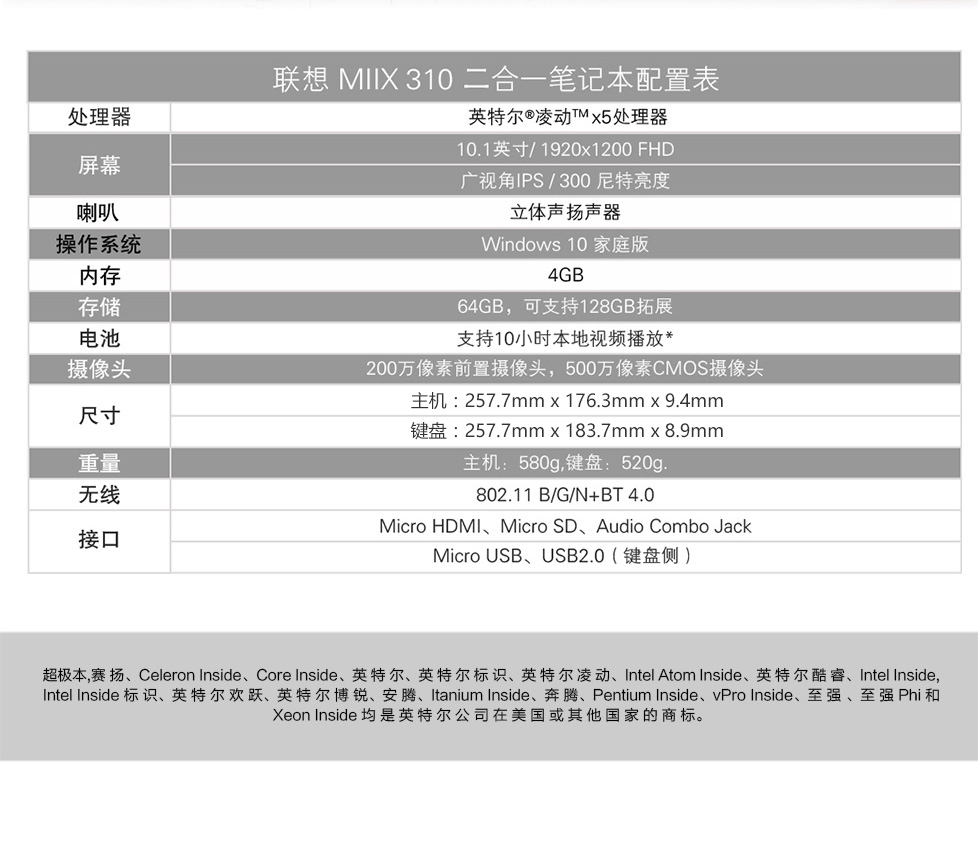 呈贡联想二合一笔记本 MIIX 310 10.1”